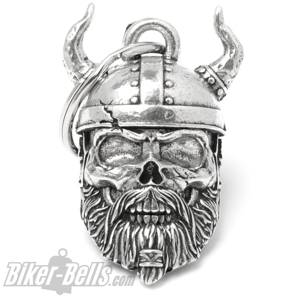 Startseite » Biker-Bells kaufen » Bravo Bells » 3D Wikinger Totenkopf Biker-Bell mit Bart und gehörntem Helm Glücksbringer Glocke