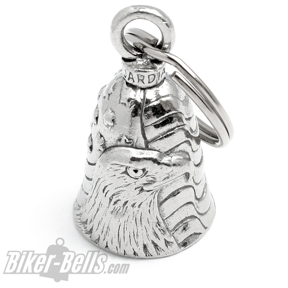 Startseite    »    Biker-Bells kaufen    »    Guardian Bells    »   Patriotische Guardian Bell mit Adlerkopf vor USA-Flagge Stars and Stripes Geschenk