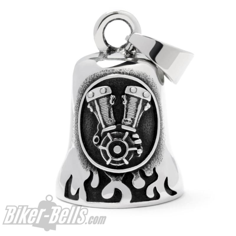 Main page » Buy some Biker-Bells » Road Bells » V2 Engine Block With Flames Biker-Bell Stainless Steel Engine Ride Bell Lucky Charm